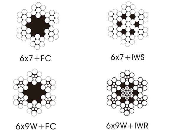 Cada fio tem três componentes básicos: os fios, fios e núcleo. O núcleo pode ser fibra (FC), como sisal, manila ou juta, ou um Núcleo de Corda Independente (IWRC), que na verdade é um cabo de aço menor dentro dos fios do cabo externo.