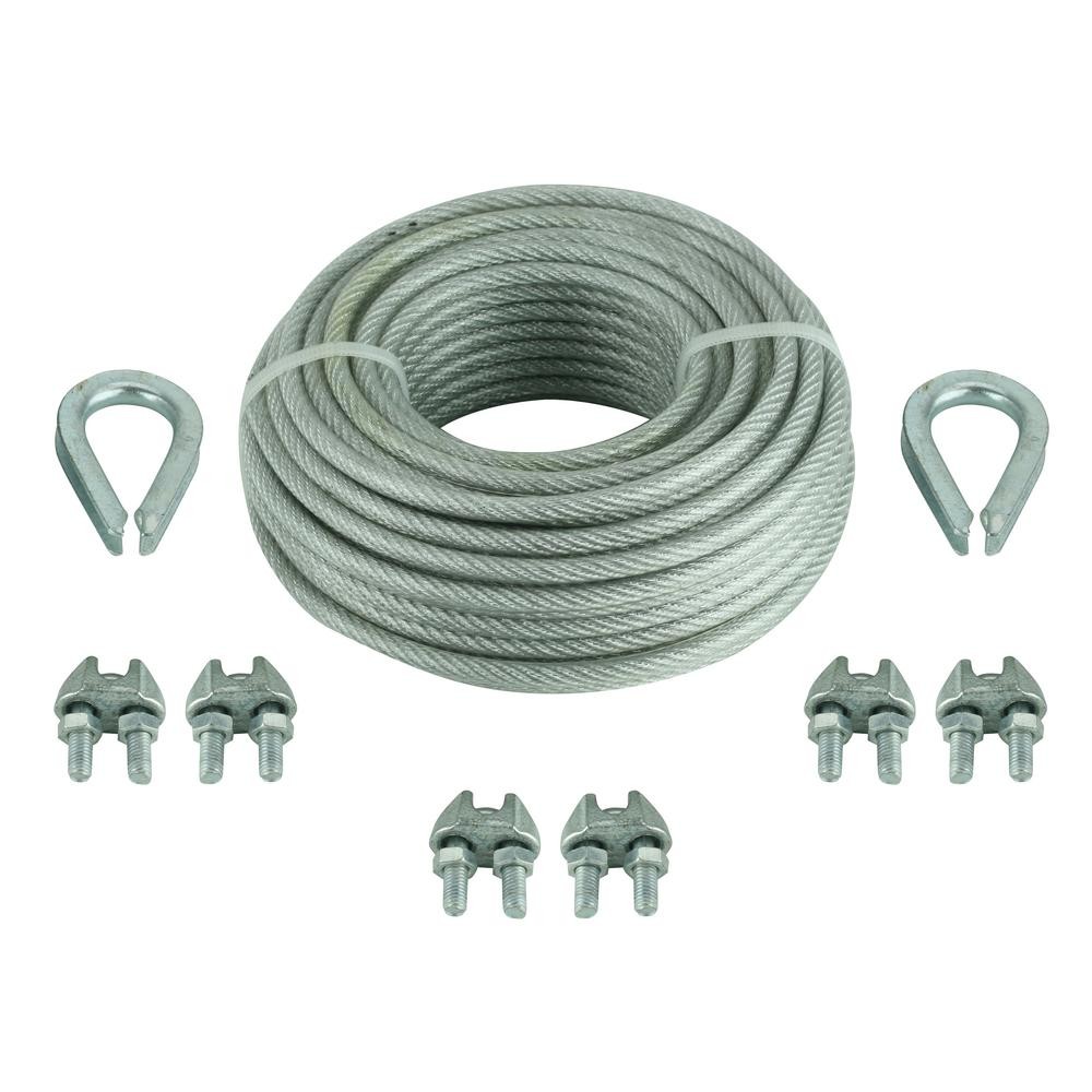 O kit de cabo de aço galvanizado revestido com vinil de 1/8 pol. X 30 pés inclui 2 dedais e 6 grampos para sua conveniência. Este kit de cabo de aço revestido de vinil resiste à ferrugem para uso prolongado.