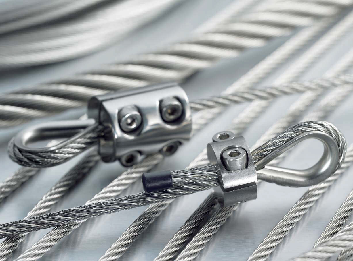 A capacidade de um sistema dado é determinada pelo tipo e pela colocação dos encaixes da corda de fio no conjunto. Os encaixes comuns incluem as braçadeiras, os grampos, as luvas, as relações, os ganchos, as forquilhas, os olhos, os parafusos prisioneiros, e os pinos. A utilidade e a segurança adicionada tidas recursos para pelos conjuntos da corda de fio permitem seu uso em arenas comerciais e residenciais além do que suas aplicações tradicionais no setor industrial.