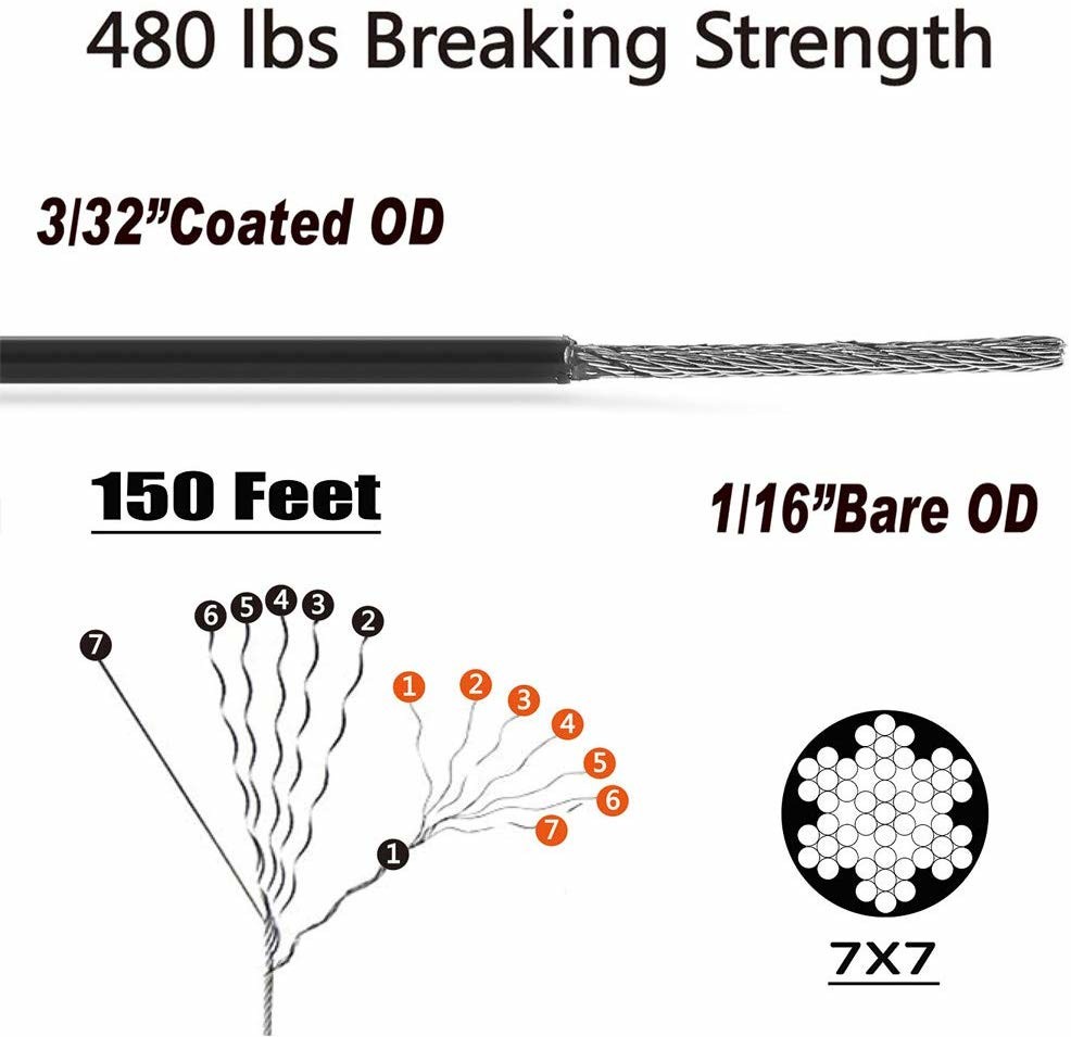 Jogo de suspensão claro da corda com 150 FT de cabo de aço inoxidável revestido | Resistente & fácil instalar o jogo da suspensão da luz da corda do globo do fio de guia (preto)