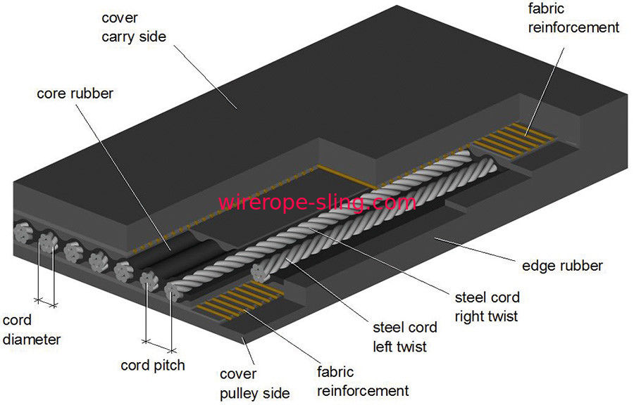 Comparado às correias transportadoras de matéria têxtil, estas correias têm uma força mais de alta elasticidade, um mais baixo alongamento, e a resistência de impacto superior. As correias transportadoras do cabo de aço são projetadas para finalidades da pesado-mineração e os transportes do material de maioria sobre distâncias longas. São compostos do fio de torção esquerdo e direito arranjado uniformemente e longitudinalmente na correia.